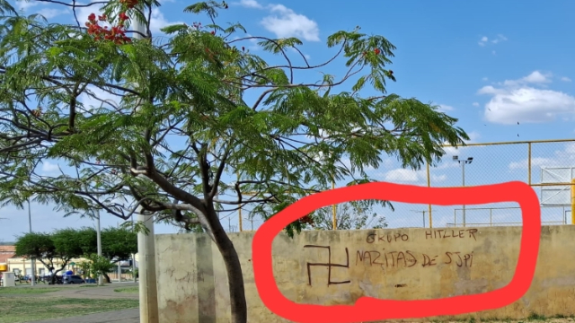 Na última semana, um grupo ainda não identificado, autodenominado "Nazistas de SJPI", deixou marcas de vandalismo na Quadra Manoel Leite, localizada ao lado da Praça de Eventos, no centro de São João do Piauí.