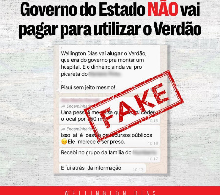 O governador Wellington Dias (PT) desmentiu na tarde desta quinta-feira, 02 de abril, a notícia falsa que circula nas redes sociais dando conta de que o Governo estaria pagando uma espécie de aluguel para usar o espaço do Ginásio Verdão como hospital de campana. A mensagem replicada em aplicativos como o WhatsApp é mentirosa, e surge no momento em que o Estado luta contra a pandemia do novo coronavírus.