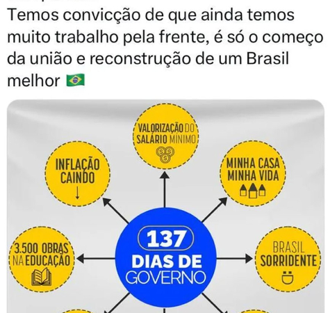 "O Governo segue trabalhando para melhorar a vida da população, com programas como o Brasil Sorridente, Mais Médicos, Bolsa Família, entre outras conquistas. Temos convicção de que ainda temos muito trabalho pela frente, é só o começo da união e reconstrução de um Brasil melhor", afirma o texto.