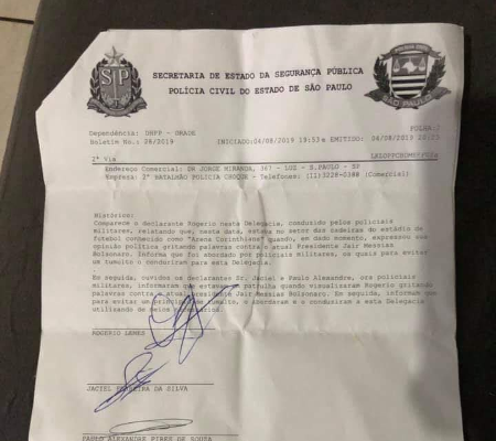 Aconteceu ontem em São Paulo, durante o clássico envolvendo o Corinthians e o Palmeiras, na Arena Corinthians. O registro do boletim de ocorrência feito por um policial que trabalhava no local, inacreditavelmente, cita as razões para a detenção e condução à delegacia de um “declarante”: “no setor de cadeiras do estádio, expressou sua opinião política gritando palavras contra o atual presidente Jair Messias Bolsonaro”.
