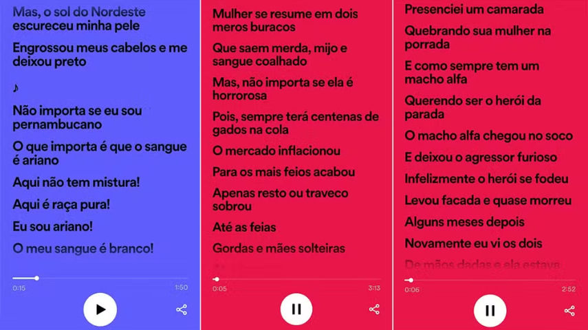 Em músicas seguintes ele associa religiões de matriz africana, nordestinos, negros e a África à pobreza, os ataques incluem também pessoas transgênero. Nesta quarta-feira (13) o perfil do investigado foi retirado do ar pelo Spotify.
