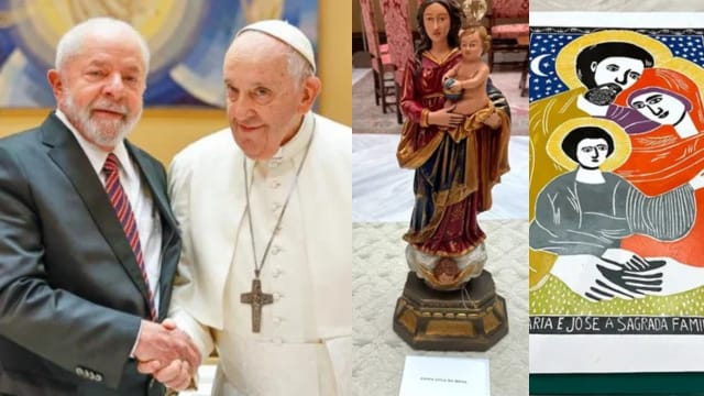 No encontro realizado no Vaticano nesta quarta-feira (21), o presidente Luiz Inácio Lula da Silva e a primeira-dama, Janja da Silva, trocaram presentes com o Papa Francisco. A primeira-dama presenteou o Papa com uma imagem de Nossa Senhora de Nazaré, considerada a padroeira da Amazônia.