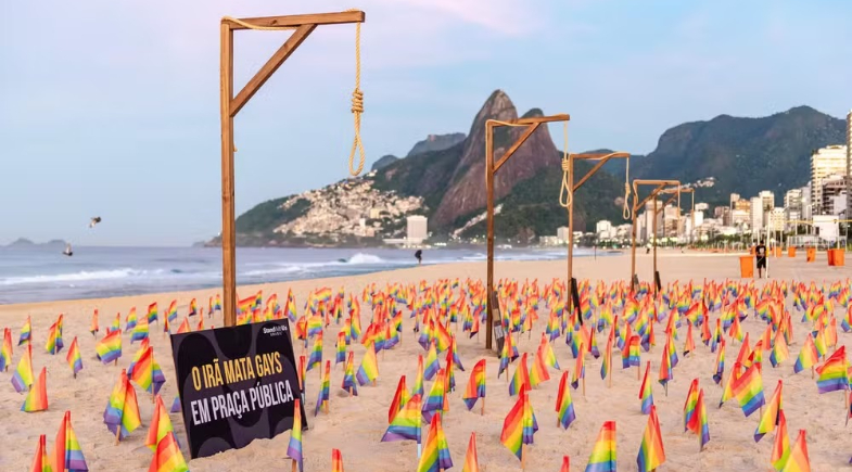 A manifestação ocorreu na altura da Rua Farme de Amoedo, ponto tradicional da comunidade LGBTQIA+ na cidade, onde foram instaladas dez mil bandeiras com as cores do orgulho e dez estruturas em forma de forca.