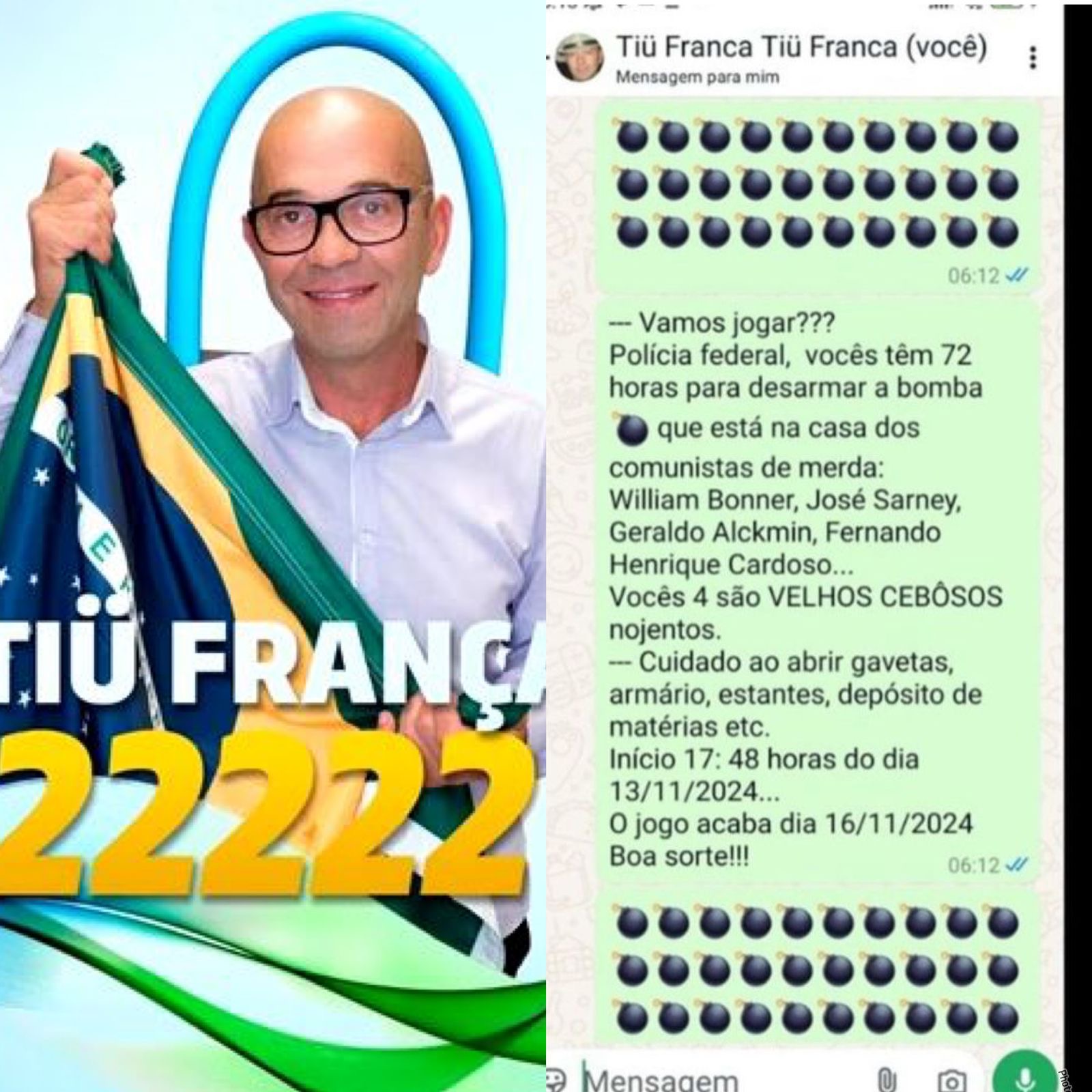“Vamos jogar??? Polícia Federal, vocês têm 72 horas para desarmar a bomba que está na casa dos comunistas de merda: William Bonner, José Sarney, Geraldo Alckmin, Fernando Henrique Cardoso… Vocês 4 são VELHOS CEBÔSOS nojentos”, escreveu ele, em imagem publicada no Facebook.