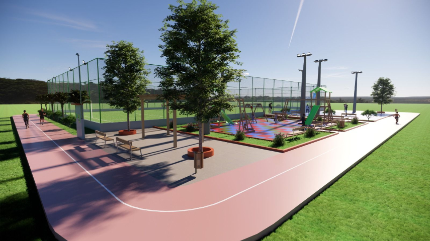 O QUE VAI TER: O complexo terá um campo de futebol society de 30 x 50 metros de dimensão, meia quadra de basquete para prática da modalidade 3 x 3, pista de caminhada no entorno e um parquinho / playground infantil.