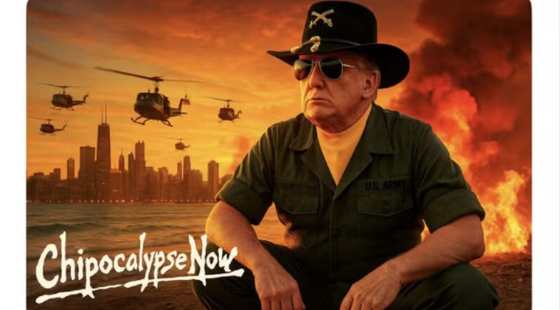 O presidente dos Estados Unidos, Donald Trump, voltou a elevar o tom contra cidades governadas por democratas. No sábado (6), ele publicou em sua rede social uma montagem inspirada no filme “Apocalypse Now”, mostrando helicópteros sobre Chicago em meio a uma explosão.