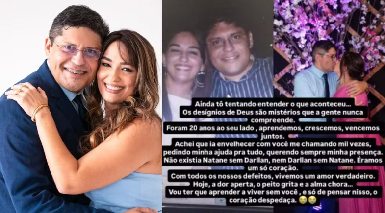 “Ainda tô tentando entender o que aconteceu. Os desígnios de Deus são mistérios que a gente nunca compreende. Foram 20 anos ao seu lado, aprendemos, crescemos e vencemos juntos. Achei que ia envelhecer com você me chamando mil vezes, pedindo a minha ajuda pra tudo, querendo sempre minha presença. Não existe Natane sem Darllan. Hoje, a dor aperta, o peito grita e a alma chora.”