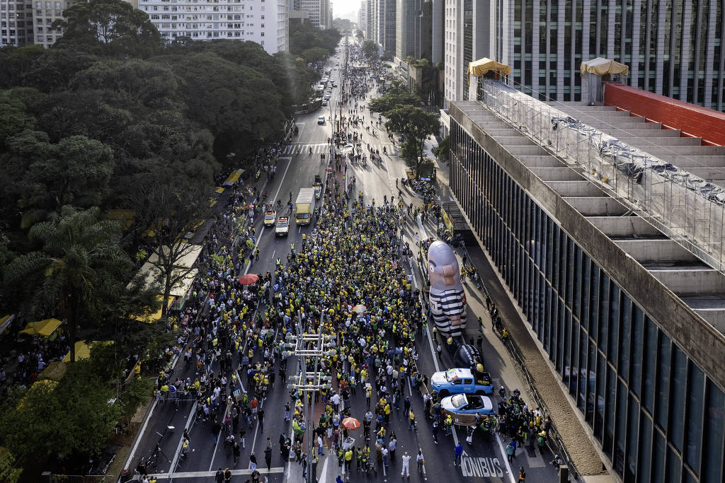 Vestidos de verde e amarelo, os manifestantes ocuparam menos de um quarteirão em frente ao Masp, em apenas um dos sentidos da via. Enfeitando uma pick-up pintada com as cores da bandeira da Argentina de Javier Milei, estavam bonecos de Olinda do político americano, que disputará a eleição presidencial dos EUA em novembro, e do ex-presidente Jair Bolsonaro (PL), sorrindo lado a lado. Um gigante Lula, vestido de presidiário, também compunha o cenário.