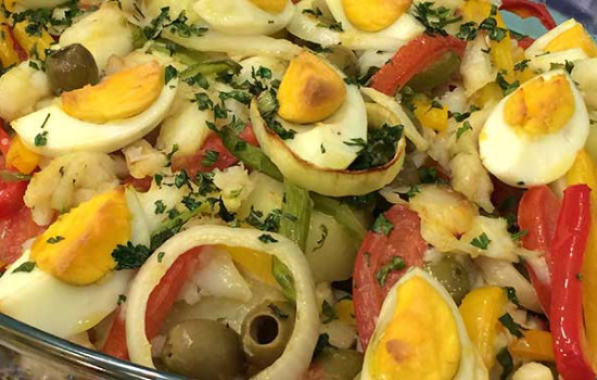 - Acrescente o bacalhau, a azeitona, cheiro-verde e regue com o restante do azeite.