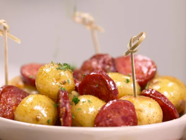 Batata assada com calabresa é o tipo de receita ideal para comer como petisco de uma reunião em família ou com amigos. Mas, se preferir, você também pode comer como acompanhamento ou entrada das refeições. Para fazer esta receita, você vai precisar de linguiça calabresa, óleo, vinagre, colorau e batata bolinha cozida. Tudo isso é assado no forno por cerca de 35 minutos e finalizado com salsinha.