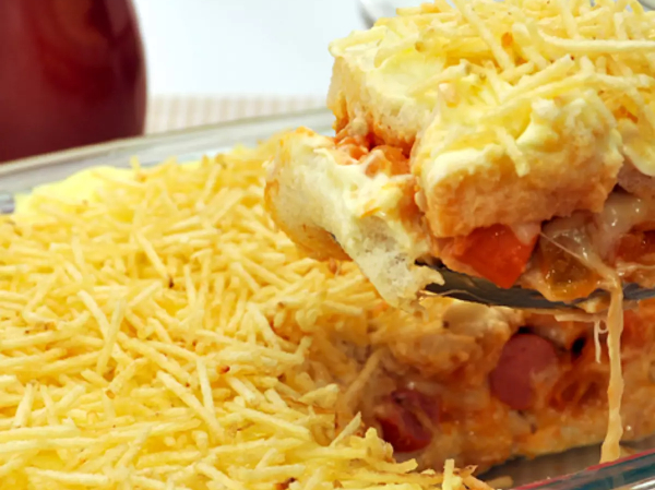 - Em um refratário grande, intercale camadas de pão, de maionese, de queijo e de molho, terminando em pão e maionese.
