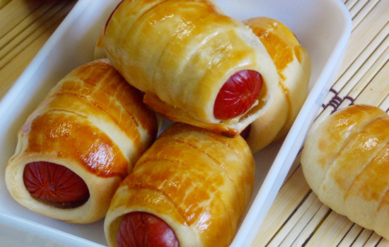 Coloque 5 salsichas na ponta da massa e enrole-as, cote em 10 pedaços, repita o processo com as outras 4 partes e distribua em 2 formas retangulares.