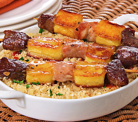 - Em espetinhos de madeira para churrasco, intercale cubos de carne, queijo e lombo, repetindo até acabarem os ingredientes.