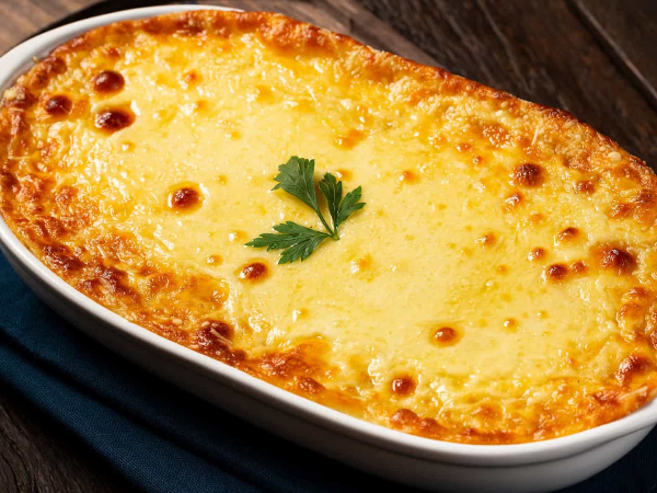 Em seguida, em um refratário untado com óleo, faça uma camada com o purê de mandioca, faça outra camada com a carne seca, polvilhe o queijo ralado e cubra com o restante do purê;