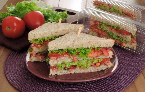 - Faça cada sanduíche utilizando a fatia de pão, um pouco do recheio, fatias de tomate e folhas de alface, mais uma fatia de pão, mais uma camada de recheio de tomate e de alface e termine com pão.