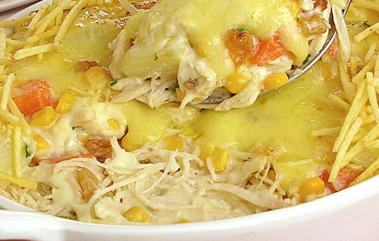 - Adicione o frango, o milho, a uva-passa, o requeijão, a maionese, sal e cheiro-verde.
