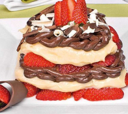 Leve à geladeira por 30 minutos. Decore com raspas de chocolate, morangos e sirva em seguida.