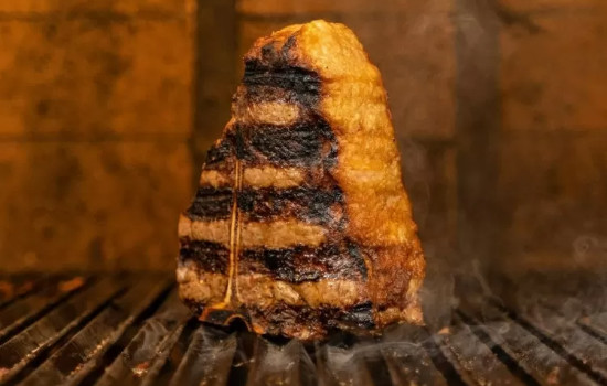 Depois de estagiar na churrasqueira tipo parrilla argentina até caramelizar, o corte é servido em prato quente, quente e regado a manteiga clarificada.
