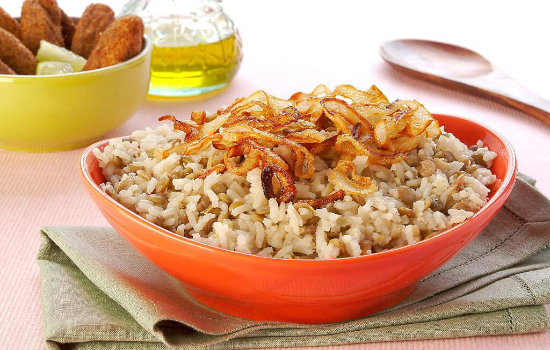 - Escorra em papel-absorvente para secar. Sirva o arroz com as cebolas por cima, decorando o prato.