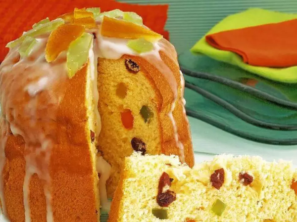 - Cubra com os ingredientes do glacê misturados, frutas cristalizadas e passas.