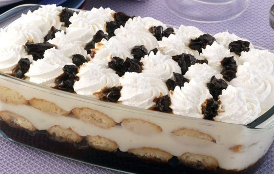- Em um refratário médio, espalhe a geleia de ameixa e faça uma camada de biscoito umedecido no leite misturado com o rum.