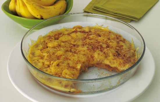 - Espalhe no fundo de um refratário redondo pequeno e leve ao micro-ondas em potência média por 4 minutos ou em forno convencional, preaquecido, por 12 minutos. - Espalhe a banana, o queijo e polvilhe com o açúcar e a canela.