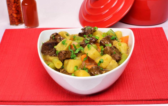 - Aqueça uma panela de pressão com o óleo e frite a cebola, o alho e a carne temperada com sal e pimenta por 3 minutos ou até dourar.