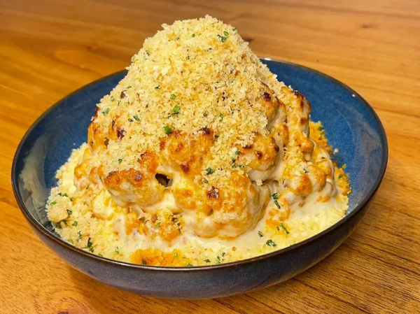- Retire a couve flor do forno, tire o papel alumínio e leve ela para uma travessa de servir, regue com o molho branco, rale parmesão por cima e leve para o forno para gratinar.