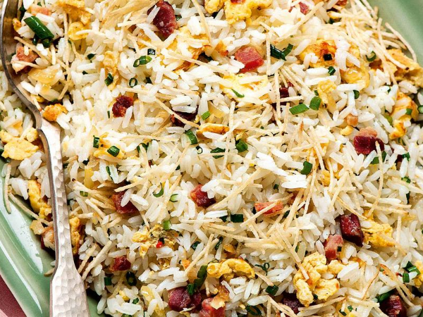 - Junte o arroz, o bacon reservado e a cebolinha e misture bem.