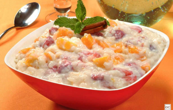 Que tal inovar no preparo do arroz doce? O arroz doce de pressão é uma receita prática, que fica muito saborosa! Sirva com manga e morangos: