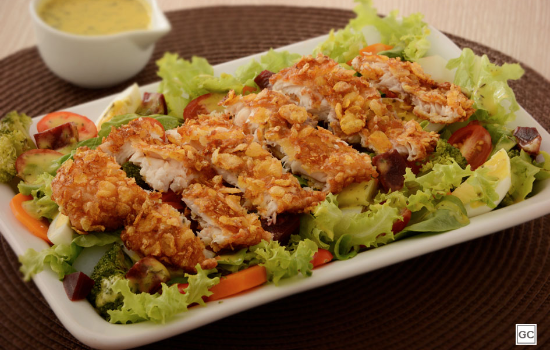 - Regue com os ingredientes do molho misturados, corte os filés em tiras e sirva sobre a salada.