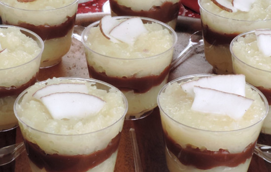 - Distribua metade da bala de coco no fundo de copinhos individuais, faça uma camada com o brigadeiro e cubra com a bala de coco restante.
