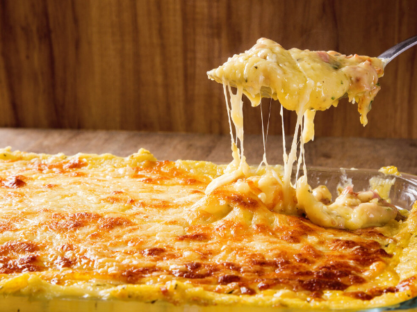- Em um refratário coloque o macarrão, despeje o molho e polvilhe o queijo ralado.