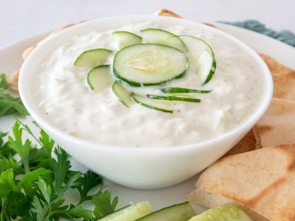 - Em um liquidificador, coloque os pedaços de pepino, o iogurte, o alho, o suco de limão , as folhas de hortelã e o azeite.