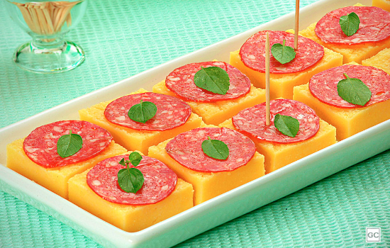 - Coloque uma fatia de salame em cima de cada quadrado de polenta e espete com um palito.