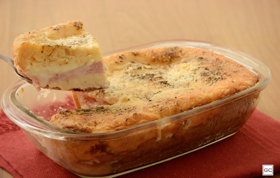 - Por cima, espalhe o presunto, o queijo, o tomate e o Catupiry.