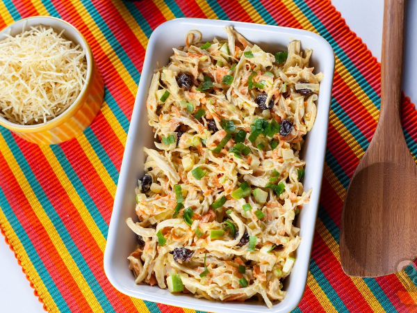 - Em seguida, transfira para uma tigela e acrescente o restante dos ingredientes, exceto a batata palha e a maionese.
