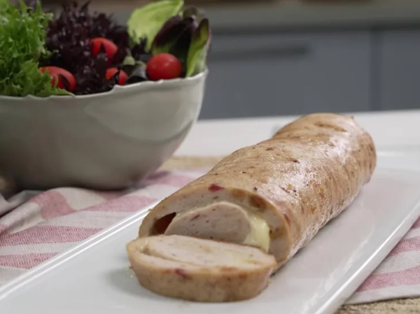 Massa do rocambole é feita com frango e linguiça calabresa e leva recheio de queijo muçarela.