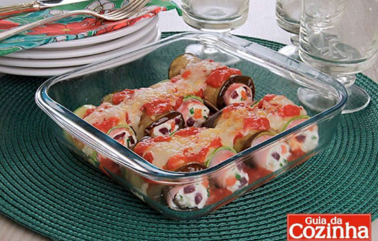 - Sobre o presunto distribua o recheio de ricota entre as fatias de berinjela assada e abobrinha.