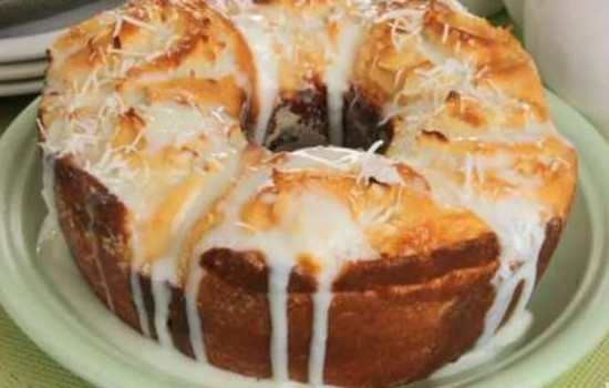 - Corte em fatias e disponha em uma fôrma de buraco no meio grande untada e enfarinhada, sobrepondo as fatias.