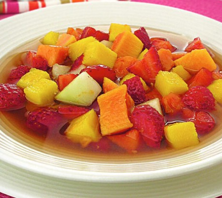 - Depois, em pratos fundos, coloque as frutas picadas e o chá reduzido. - Decore com as folhas de hortelã e sirva em seguida!