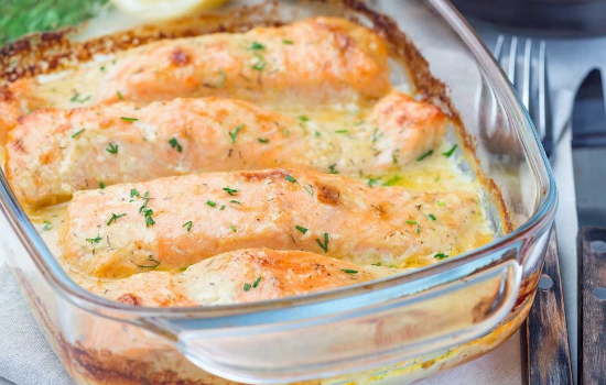 4. Coloque os filés em um refratário untado com óleo e cubra-os com o creme reservado.