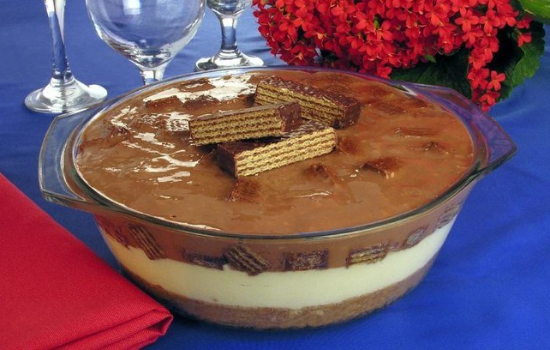 - Retire a travessa do congelador, cubra com o creme e decore com Bis cortado ao meio no sentido do comprimento.