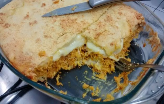 - Para a massa, bata no liquidificador o leite, o requeijão, o óleo, os ovos, o sal, o amido de milho, a farinha e o fermento até ficar homogêneo.