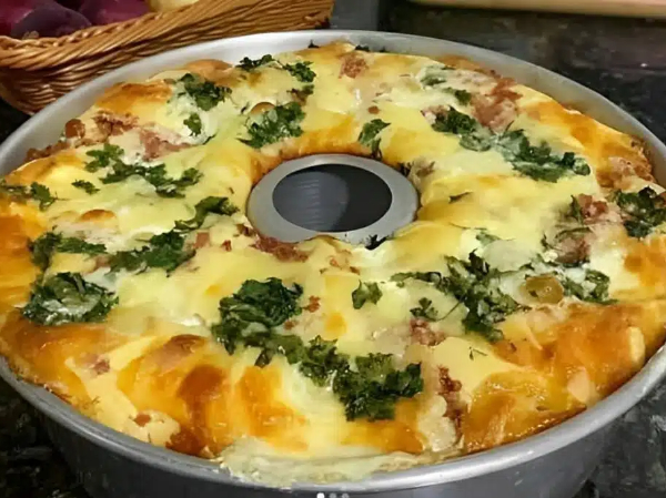- Espalhe o restante da massa por cima, salpique um pouco da mistura de calabresa com bacon e muçarela reservada e finalize com coentro, se gostar.